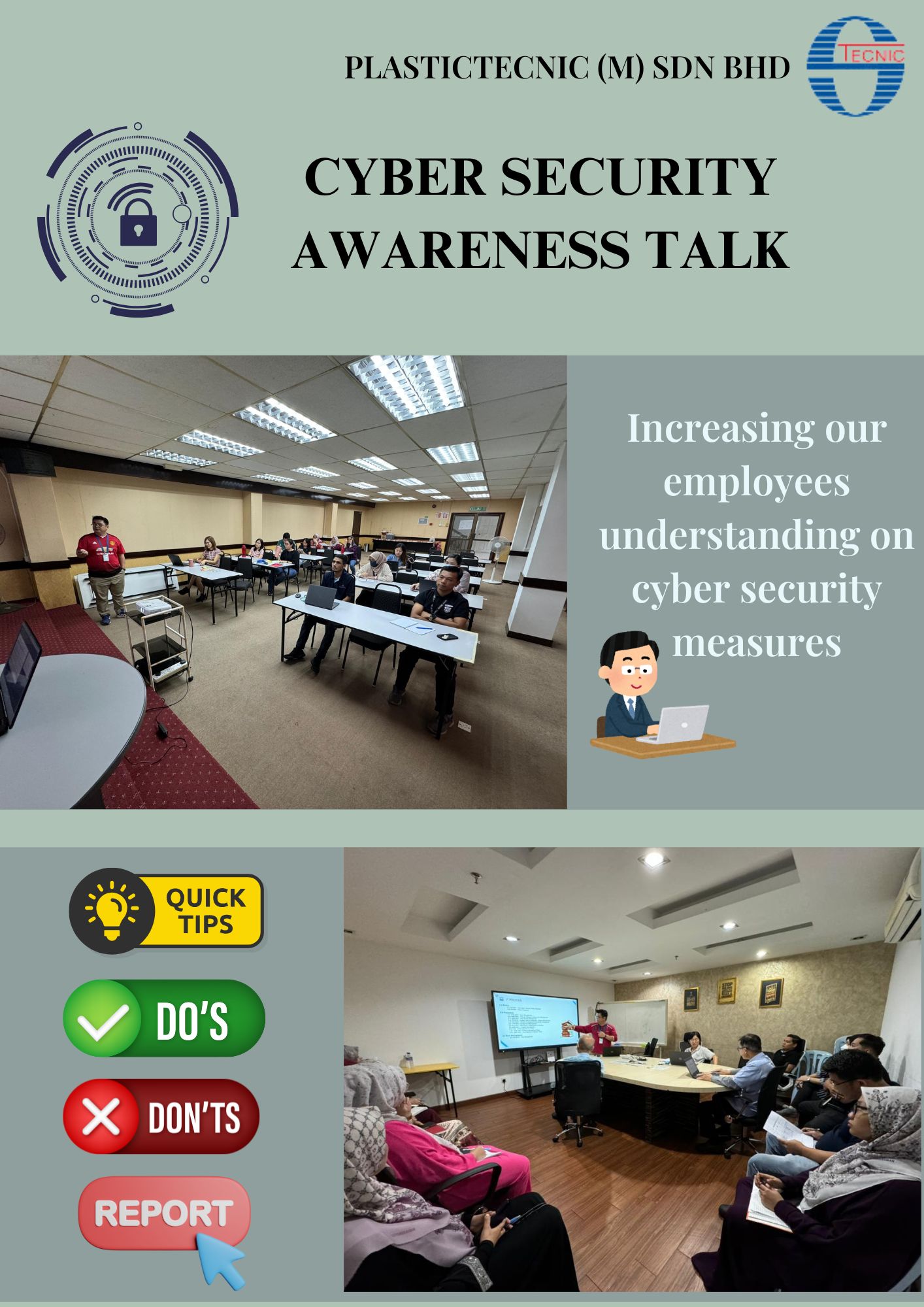 We held a cybersecurity awareness talk for all staff in both Bangi and Nilai site in June 2024. This informative session provides valuable insights into current cyber threats trend, best practices, and red flags to watch out for.