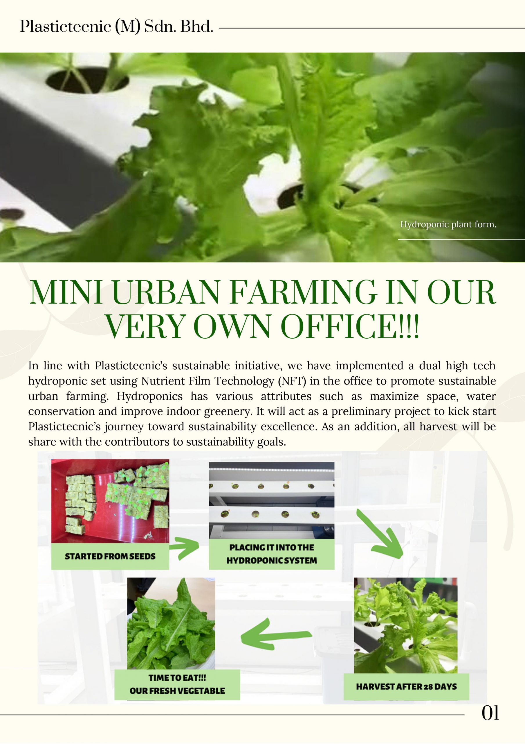 In line with Plastictecnic’s sustainable initiative, we have implemented a dual high tech hydroponic set using Nutrient Film Technology (NFT) in the office to promote sustainable urban farming. Hydroponics has various attributes such as maximize space, water conservation and improve indoor greenery. It will act as a preliminary project to kick start Plastictecnic’s journey toward sustainability excellence. As an addition, all harvest will be shared with the contributors to sustainability goals.