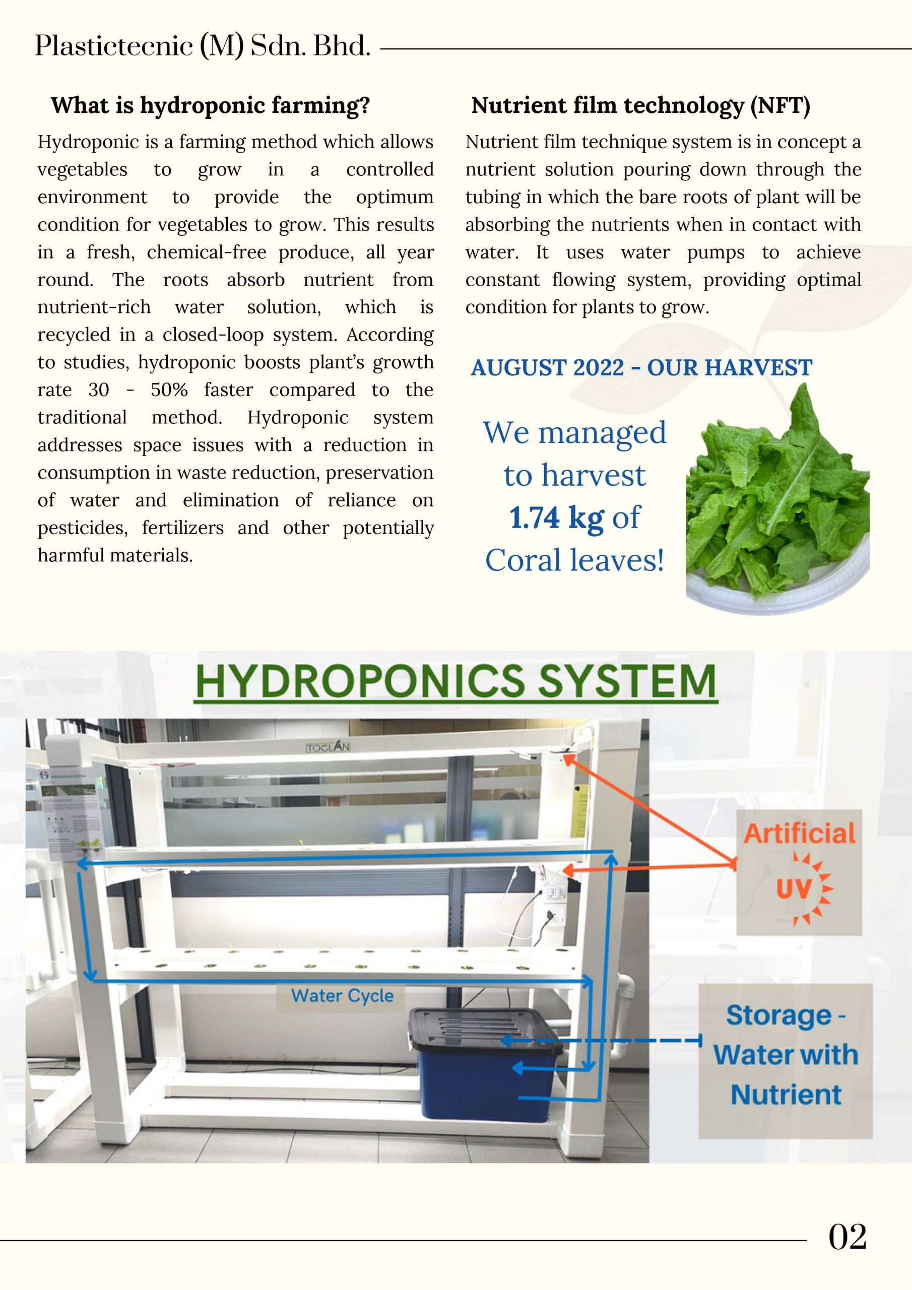 Hydroponic system addresses space issues with a reduction in consumption in waste reduction, preservation of water and elimination of reliance on pesticides, fertilizers and other potentially harmful materials. We managed to harvest 1.74kg of coral leaves!