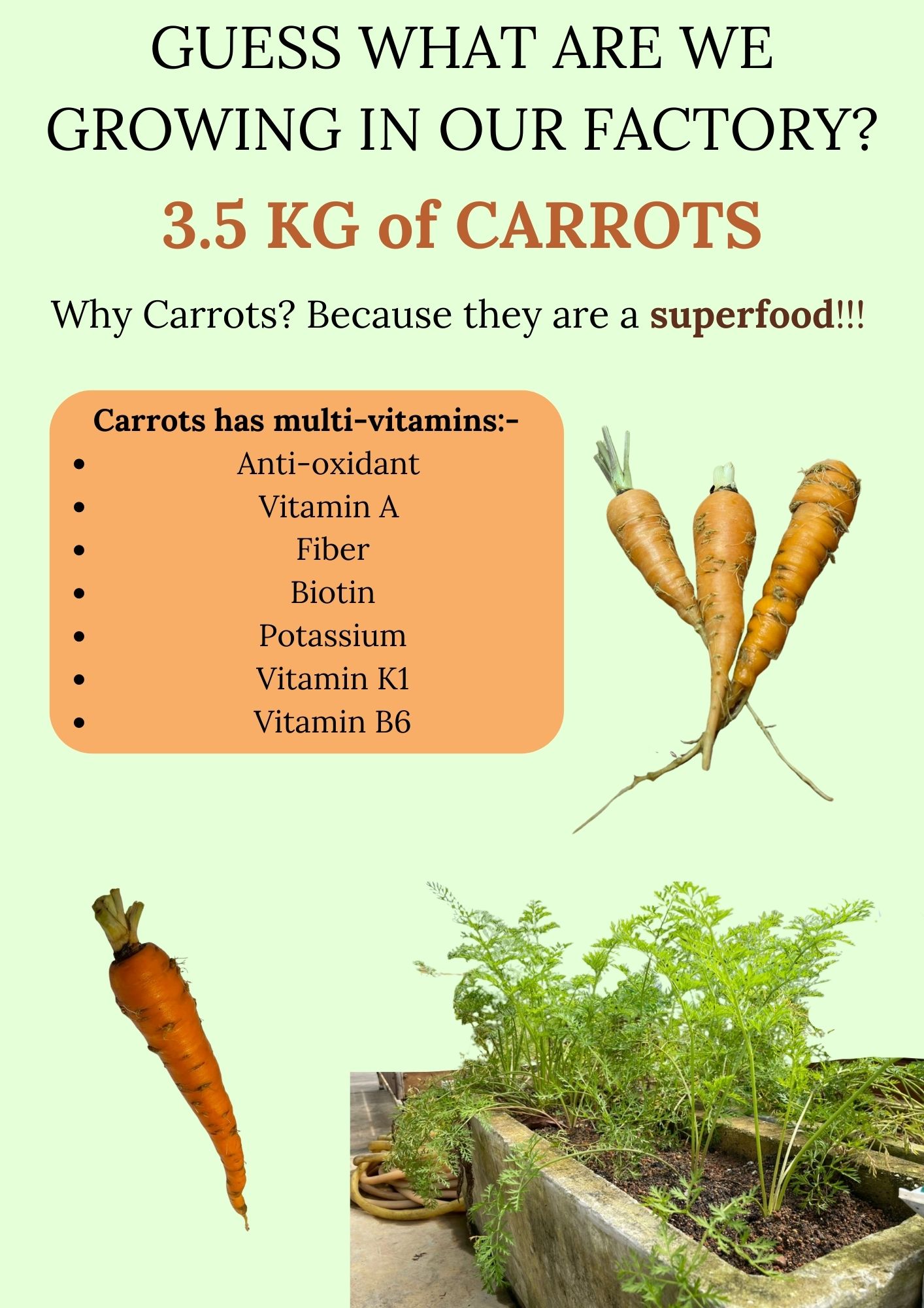 Previously, we have initiated urban farming in our company through hydroponic system to grow some leafy vegetables. Now, we are growing CARROTS in our factory to explore the potential of urban farming with different vegetables. After the harvest, we gave the carrots to our employees for them to enjoy some organic carrot.